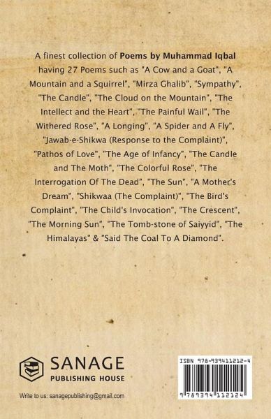 A finest collection of Poems by Muhammad Iqbal having 27 Poems such as "A Cow and a Goat", "A Mountain and a Squirrel", "Mirza Ghalib", "Sympathy", "The Candle", "The Cloud on the Mountain", "The Intellect and the Heart", "The Painful Wail", "The Withered Rose", "A Longing", "A Spider and A Fly", "Jawab-e-Shikwa (Response to the Complaint)", "Pathos of Love", "The Age of Infancy", "The Candle and The Moth", "The Colorful Rose", "The Interrogation Of The Dead", "The Sun", "A Mother's Dream", "Shikwaa (The Complaint)", "The Bird's Complaint", "The Child's Invocation", "The Crescent", "The Morning Sun", "The Tomb-stone of Saiyyid", "The Himalayas" & "Said The Coal To A Diamond".