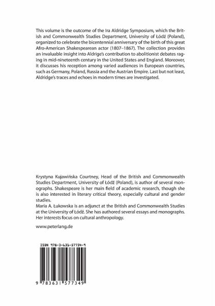 This volume is the outcome of the Ira Aldridge Symposium, which the British and Commonwealth Studies Department, University of Lódz (Poland), organized to celebrate the bicentennial anniversary of the birth of this great Afro-American Shakespearean actor (1807-1867). The collection provides invaluable insight into Aldridge's contribution to abolitionist debates raging in mid-nineteenth century in the United States and England. Moreover, it discusses his reception among varied audiences in European countries, such as Germany, Poland, Russia and the Austrian Empire. Last but not least, Aldridge's traces and echoes in modern times are investigated.