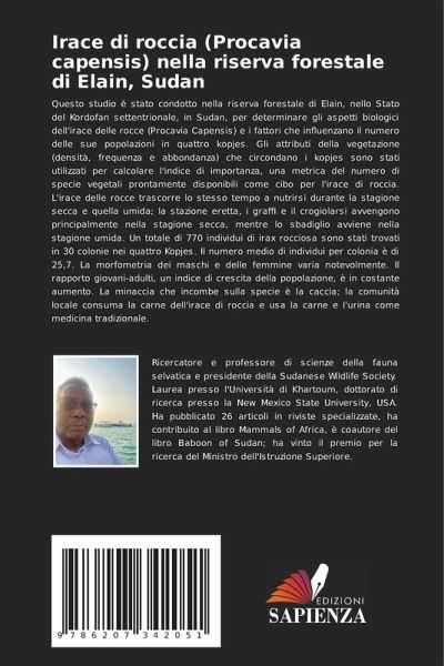 Questo studio è stato condotto nella riserva forestale di Elain, nello Stato del Kordofan settentrionale, in Sudan, per determinare gli aspetti biologici dell'irace delle rocce (Procavia Capensis) e i fattori che influenzano il numero delle sue popolazioni in quattro kopjes. Gli attributi della vegetazione (densità, frequenza e abbondanza) che circondano i kopjes sono stati utilizzati per calcolare l'indice di importanza, una metrica del numero di specie vegetali prontamente disponibili come cibo per l'irace di roccia. L'irace delle rocce trascorre lo stesso tempo a nutrirsi durante la stagione secca e quella umida; la stazione eretta, i graffi e il crogiolarsi avvengono principalmente nella stagione secca, mentre lo sbadiglio avviene nella stagione umida. Un totale di 770 individui di irax rocciosa sono stati trovati in 30 colonie nei quattro Kopjes. Il numero medio di individui per colonia è di 25,7. La morfometria dei maschi e delle femmine varia notevolmente. Il rapporto giovani-adulti, un indice di crescita della popolazione, è in costante aumento. La minaccia che incombe sulla specie è la caccia; la comunità locale consuma la carne dell'irace di roccia e usa la carne e l'urina come medicina tradizionale.