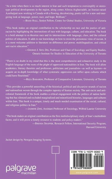 "This provides a powerful unraveling of the historical, political and discursive strands of racism and nationalism woven through the complex tapestry of Iranian society. The anti-racist and anti-colonial framework of the book enables a critical engagement with the politics of nation building that has silenced and excluded marginalized and minoritized histories, languages and cultures within Iran.This book is a unique, timely and much needed examination of the social, cultural and religious politics in Iran." - Jasmine Zine, Assistant Professor of Sociology, Wilfrid Laurier University
