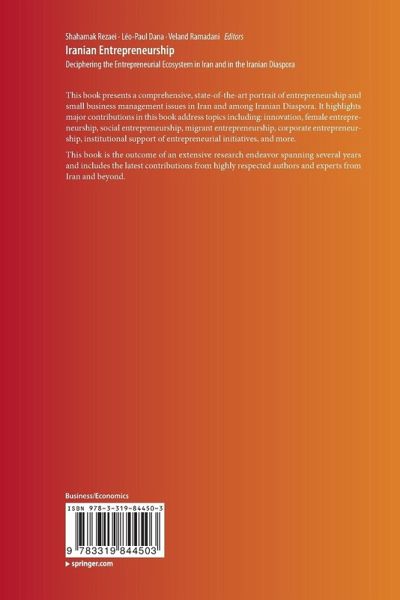 Introduction to Iranian Entrepreneurship.- Entrepreneurship Policy in Iran.- The Role of Business Regulations in Economic Growth of Iran.- Business Startup in Iran: Entrepreneurial Skills, Personality, and Motivation of Iranian Nascent Entrepreneurs.- Novice Entrepreneurs' Entrepreneurial Self-Efficacy and Passion for Entrepreneurship.- How Do Iranian SMEs Utilize External Knowledge Flows for Corporate Entrepreneurship? The Role of Externally Oriented Capabilities ,- Women's Entrepreneurship in Iran.- Academic Entrepreneurship Readiness in University of Tehran.- Effect of Organizational Climate and Structure on Innovation Performance.- Transnational Entrepreneurship in a Diaspora.-Transnational Iranian entrepreneurs in the import/export industry of Los Angeles.- Entrepreneurial Competencies Benefiting Entrepreneurial Intention: Iranian Adults at Home and in The Diaspora.- Networks around Women and Men Entrepreneurs in the Iranian Diaspora: Dual Embeddedness in Iran and In Host-Society.- Iranian Entrepreneurs at Home and in Diaspora: Entrepreneurial Competencies, Exporting, Innovation and Growth-Expectations.- Networks around Iranian Entrepreneurs at Home and In Diaspora: Effects on Performance.- The Reinvigorating of International Entrepreneurship by Open Innovation Strategy for Iranian Businesses.- Design of the 'International Entrepreneurial Marketing (IEM) Pattern': Entrepreneurial Firms of Food Industries throughout Iran.- Identifying Factors Affecting Export Performance of Sports Equipment and Sportswear Firms.- A DNA Business Model for the Internet of Things: A Value-Creating Ecosystem in Iranian Small and Medium-Sized Enterprises.- Marketing & Branding for Iranian Home-Based Businesses.- The Effects of Mergers and Acquisitions on the Bank Performance and Entrepreneurial Orientation.