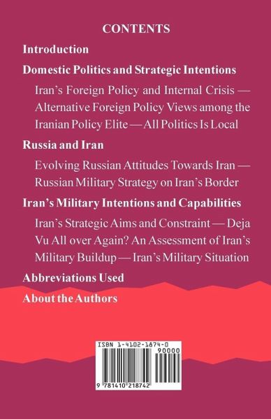 CONTENTS: Introduction Domestic Politics and Strategic Intentions Iran's Foreign Policy and Internal Crisis --- Alternative Foreign Policy Views among the Iranian Policy Elite --- All Politics Is Local Russia and Iran Evolving Russian Attitudes Towards Iran --- Russian Military Strategy on Iran's Border Iran's Military Intentions and Capabilities Iran's Strategic Aims and Constraint --- Deja Vu All over Again? An Assessment of Iran's Military Buildup --- Iran's Military Situation Abbreviations Used About the Authors