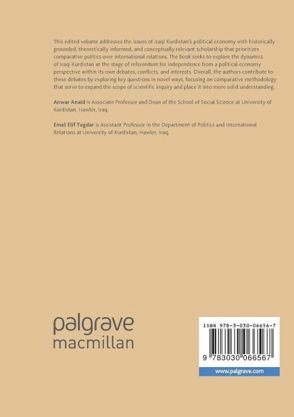 This edited volume addresses the issues of Iraqi Kurdistan's political economy with historically grounded, theoretically informed, and conceptually relevant scholarship that prioritizes comparative politics over international relations. The book seeks to explore the dynamics of Iraqi Kurdistan at the stage of referendum for independence from a political economy perspective within its own debates, conflicts, and interests. Overall, the authors contribute to these debates by exploring key questions in novel ways, focusing on comparative methodology that serve to expand the scope of scientific inquiry and place it into more solid understanding.