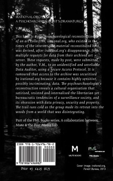 This book is a psychoarchaeological reconstruction of an art collective, irational.org, who existed in the times of the internet. The material reconstituted here was derived, after irational.org's disappearance, from multiple requests for data from their archived art server. These requests, made by post, were submitted by the author, V.M., to an unidentified and unreliable Data Auditor, using a Secure Access Protocol. It is rumoured that access to the archive was securitised by irational.org because it contains highly sensitive, possibly incriminating, data. The psychoarchaeologist's reconstruction reveals a cultural organisation that satirised, resisted and internalised the libertarian yet bureaucratic tendencies of a surveillance society, and its obsession with data privacy, security and property. The trail runs cold as the group made its retreat into the woods from a world that was disintegrating. Part of the PML Books series. A collaboration between Mute & the Post-Media Lab
