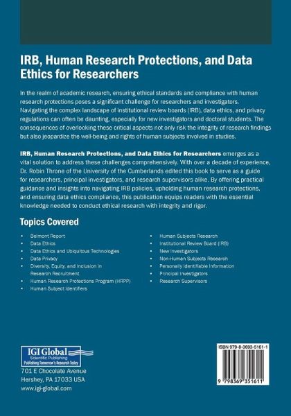 In the realm of academic research, ensuring ethical standards and compliance with human research protections poses a significant challenge for researchers and investigators. Navigating the complex landscape of institutional review boards (IRB), data ethics, and privacy regulations can often be daunting, especially for new investigators and doctoral students. The consequences of overlooking these critical aspects not only risk the integrity of research findings but also jeopardize the well-being and rights of human subjects involved in studies. IRB, Human Research Protections, and Data Ethics for Researchers emerges as a vital solution to address these challenges comprehensively. With over a decade of experience, Dr. Robin Throne of the University of the Cumberlands edited this book to serve as a guide for researchers, principal investigators, and research supervisors alike. By offering practical guidance and insights into navigating IRB policies, upholding human research protections, and ensuring data ethics compliance, this publication equips readers with the essential knowledge needed to conduct ethical research with integrity and rigor.