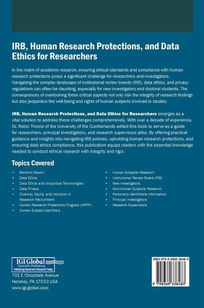 In the realm of academic research, ensuring ethical standards and compliance with human research protections poses a significant challenge for researchers and investigators. Navigating the complex landscape of institutional review boards (IRB), data ethics, and privacy regulations can often be daunting, especially for new investigators and doctoral students. The consequences of overlooking these critical aspects not only risk the integrity of research findings but also jeopardize the well-being and rights of human subjects involved in studies. IRB, Human Research Protections, and Data Ethics for Researchers emerges as a vital solution to address these challenges comprehensively. With over a decade of experience, Dr. Robin Throne of the University of the Cumberlands edited this book to serve as a guide for researchers, principal investigators, and research supervisors alike. By offering practical guidance and insights into navigating IRB policies, upholding human research protections, and ensuring data ethics compliance, this publication equips readers with the essential knowledge needed to conduct ethical research with integrity and rigor.