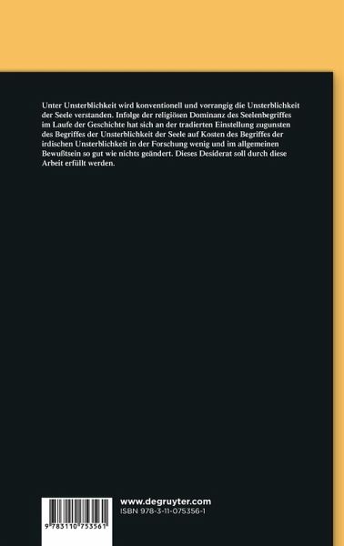 Die traditionelle bzw. religiöse Auffassung der Unsterblichkeit ist aufs engste assoziiert mit dem Begriff der Seele, so dass konventionell und bis in den allgemeinen Sprachgebrauch hinein unter Unsterblichkeit vorrangig die Unsterblichkeit der Seele verstanden wurde. Die geschichtliche Dominanz von Platonismus und Christentum im Abendland hat diese Begrifflichkeit geprägt und rückwirkend auf die Deutung des Unsterblichkeitsgedankens in der Antike eingewirkt. Es gibt aber auch ein anderes Verständnis von Unsterblichkeit, das fast ganz überlagert wurde und nahezu in Vergessenheit geriet. Es handelt sich dabei um Formen irdischer Unsterblichkeit, verkürzt ausgedrückt die biologische und die biographische. Es ist die Zielsetzung der vorliegenden Arbeit, dieses Faktum wieder bewusst zu machen und die systematischen Gestalten dieses anderen, säkularen Typus des Unsterblichkeitsgedankens anhand der uns überlieferten Testimonien zu rekonstruieren. In diesem Rahmen wird auch der Prototypdes christlichen Unsterblichkeitsbegriffes im Spektrum der antiken Geistesgeschichte synoptisch dargestellt und analysiert.