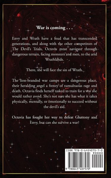 War is coming . . . Envy and Wrath have a feud that has transcended generations, and along with the other competitors of The Devil's Trials, Octavia must navigate through dangerous terrain, facing monsters and men, to the arid Wrathlands. There, she will face the sin of Wrath. The lion-branded war camps are a dangerous place, their heralding angel a frenzy of tumultuous rage and death. Octavia finds herself tasked to train for a war she would rather avoid. She's not sure she has what it takes physically, mentally, or emotionally to succeed without the devil's aid. Octavia has fought her way to defeat Gluttony and Envy, but can she survive a war?