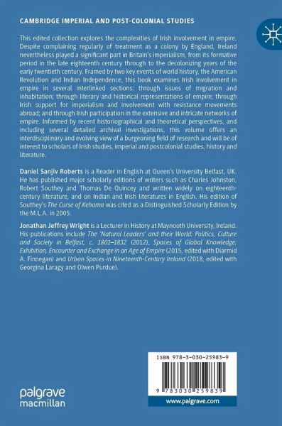 1. Introduction - Daniel Sanjiv Roberts and Jonathan Jeffrey Wright.- I Inhabiting Empire.- 2. "Residing in this Distant Portion of the Great Empire": The Irish in Imperial Halifax, Nova Scotia - Peter Ludlow and Terrence Murphy.- 3. From Enniskillen to Nairobi: The Coles in British East Africa - Eve Patten.- 4. Walking to China: Infatuation and the Irish in New South Wales - Killian Quigley.- 5. Competing Narratives: 'White Slavery', Servitude and the Irish in Late Eighteenth-Century America - Martyn Powell.- II Writing/ Imagining Empire.- 6. "Humble Obedience to the Will of Heaven": Charles Johnston's Providential and Migratory Sensibility - Daniel Sanjiv Roberts.- 7. Prudence and Prejudice in Maria Edgeworth's "Murad the Unlucky" (1804) - Sonja Lawrenson.- 8. "Purely a Local Study"?: Narratives of Empire in George Benn's History of the Town of Belfast - Jonathan Jeffrey Wright.- III Resistance/Collusion.- 9. The 1857 Indian Uprising in Irish Ballads: Voices of the Subaltern - Sarah Raphaela Adjobimey.- 10. Afghanistan, the Indian "Mutiny," and the Bicultural Stereotype of John Nicholson- Pramod K. Nayar.- 11. Violent Resistance: The Irish Revolution and India - Kate O'Malley.- IV Networking.- 12. Stateless and Destitute: The O'Rourke Family of Saint-Domingue, Nantes and Wexford, 1788-1805 - Orla Power.- 13. An Irish Surgeon in Barbados and Demerara: Vexation, Misery and Opportunity - Jennifer McLaren.- 14. "Colouring the map red": Lady Hariot Dufferin and the Imperial Networks of the Dufferin Fund - Sarah Hunter.-