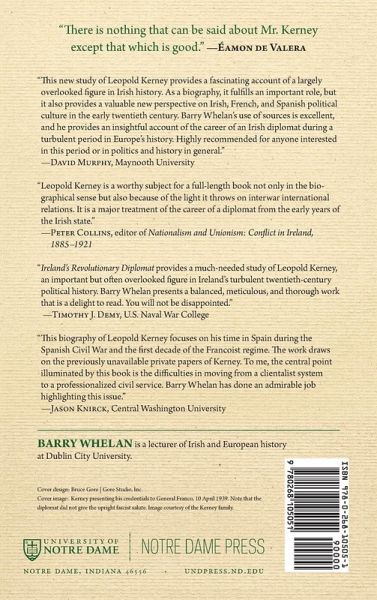 Leopold Kerney was one of the most influential diplomats of twentieth-century Irish history. This book presents the first comprehensive biography of Kerney's career in its entirety from his recruitment to the diplomatic service to his time in France, Spain, Argentina, and Chile. Barry Whelan's work provides fascinating new perceptions of Irish diplomatic history at seminal periods of the twentieth century, including the War of Independence, the Irish Civil War, the Anglo-Irish Economic War, the Spanish Civil War, and World War II, from an eyewitness to those events. Drawing on over a decade of archival research in repositories in France, Germany, Britain, Spain, and Ireland, as well as through unique and unrestricted access to Kerney's private papers, Whelan successfully challenges previously published analyses of Kerney's work and debunks many of the perceived controversies surrounding his career. Ireland's Revolutionary Diplomat brings to life Kerney's connections with leading Irish figures from the revolutionary generation including Michael Collins, Ernest Blythe, George Gavan Duffy, Desmond FitzGerald, Arthur Griffith, and Seán T. O'Kelly, as well as his diplomatic colleagues in the service. More importantly, the book illuminates the decades-long friendship Kerney enjoyed with Éamon de Valera-the most important Irish political figure of the twentieth century-and shows how the "Chief" trusted and rewarded his friend throughout their long association. The book offers a fresh understanding of the Department of External Affairs and critically assesses the roles of Joseph Walshe, secretary of the department, as well as Colonel Dan Bryan, director of G2 (Irish Army Military Intelligence), who both conspired to destroy Kerney's reputation and career during and after World War II. Whelan sheds new light on other events in Kerney's career, such as his confidential reports from fascist Spain that exposed General Francisco Franco's crimes against his people. Whelan challenges other events previously seen by some historians as controversial, including Kerney's major role in the Frank Ryan case, his contact with senior Nazi figures, especially Dr. Edmund Veesenmayer and German military intelligence, and his libel case against an acclaimed Irish historian Professor Desmond Williams. This book offers new observations on how Nazi Germany tried to utilize Kerney, unsuccessfully, as a liaison between the Irish government and Hitler's regime. Captured German documents reveal the extent of this secret plan to alter Irish neutrality during World War II, which concerned both Adolf Hitler and the leading Nazis of his regime.