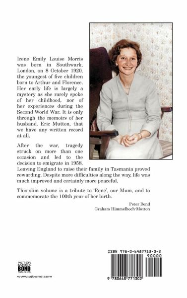 Irene Emily Louise Morris was born in Southwark, London, on 8 October 1920, the youngest of five children born to Arthur and Florence. Her early life is largely a mystery as she rarely spoke of her childhood, nor of her experiences during the Second World War. It is only through the memoirs of her husband, Eric Mutton, that we have any written record at all. After the war, tragedy struck on more than one occasion and led to the decision to emigrate in 1958. Leaving England to raise their family in Tasmania proved rewarding. Despite more difficulties along the way, life was much improved and certainly more peaceful. This slim volume is a tribute to 'Rene', our Mum, and to commemorate the 100th year of her birth.