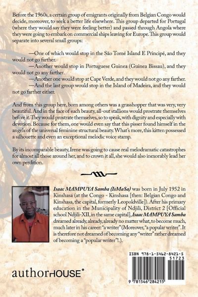Before the 1960s, a certain group of emigrants originally from Belgian Congo would decide, moreover, to seek a better life elsewhere. This group departed for Portugal (where they would say they were feeling better) and passed through Angola where they were going to embark on commercial ships leaving for Europe. This group would separate into several small groups: One of which would stop in the So Tom Island E Princip, and they would not go farther. Another would stop in Portuguese Guinea (Guinea Bissau), and they would not go any farther. Another one would stop at Cape Verde, and they would not go any farther. And the last group would stop in the Island of Madeira, and they would not go farther either. And from this group here, born among others was a grasshopper that was very, very beautiful. And in the face of such beauty, all-out stallions would prostrate themselves before it. They would prostrate themselves, so to speak, with dignity and especially with devotion. Because for them, one would even say that this pisser found himself in the angels of the universal feminine structural beauty. Whats more, this kitten possessed a silhouette and even an exceptional melodic voice stamp. By its incomparable beauty, Irene was going to cause real melodramatic catastrophes for almost all those around her, and to crown it all, she would also inexorably lead her own perdition.