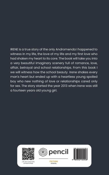 IRENE is a true story of the only Andromenda I happened to witness in my life, the love of my life and my first love who had shaken my heart to its core. The book will take you into a very beautiful imaginary scenery full of romance, love, affair, betrayal and school relationships. From this book I we will witness how the school beauty Irene shakes every man's heart but ended up with a heartless young spoiled boy who new nothing of love or relationships cared only for sex. The story started the year 2013 when Irene was still a fourteen years old young girl.