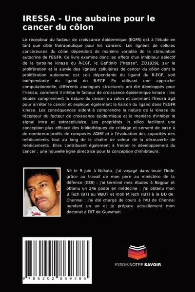 Le récepteur du facteur de croissance épidermique (EGFR) est à l'étude en tant que cible thérapeutique pour les cancers. Les lignées de cellules cancéreuses du côlon dépendent de manière variable de la stimulation autocrine de l'EGFR. Ce livre examine donc les effets d'un inhibiteur sélectif de la tyrosine kinase du R-EGF, le Gefitinib ("Iressa", ZD1839), sur la prolifération et la survie des lignées cellulaires de cancer du côlon dont la prolifération autonome est soit dépendante du ligand du R-EGF, soit indépendante du ligand du R-EGF. En utilisant une approche computationnelle, différents analogues structurels ont été développés pour l'Iressa, comment il inhibe le facteur de croissance épidermique kinase ; les études comprennent la nature du cancer du colon et comment l'Iressa agit pour arrêter le cancer et explique également la liaison du ligand dans l'EGFR kinase. Les conséquences aident à comprendre la nature de la kinase du récepteur du facteur de croissance épidermique et la manière d'inhiber le signal intra et extracellulaire. Les propriétés in silico facilitent une conception plus efficace des bibliothèques de criblage et servent de base à de nombreux profils de composés ADME et à l'évaluation des capacités des médicaments tout au long de la chaîne de valeur de la découverte de médicaments. Elles contribuent également à freiner le développement du cancer ; une nouvelle ligne directrice pour la conception d'inhibiteurs.