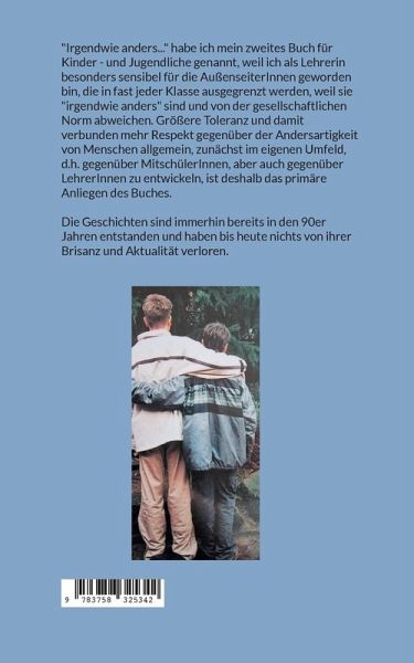 "Irgendwie anders..." habe ich mein zweites Buch für Kinder - und Jugendliche genannt, weil ich als Lehrerin besonders sensibel für die AußenseiterInnen geworden bin, die in fast jeder Klasse ausgegrenzt werden, weil sie "irgendwie anders" sind und von der gesellschaftlichen Norm abweichen. Größere Toleranz und damit verbunden mehr Respekt gegenüber der Andersartigkeit von Menschen allgemein, zunächst im eigenen Umfeld, d.h. gegenüber MitschülerInnen, aber auch gegenüber LehrerInnen zu entwickeln, ist deshalb das primäre Anliegen des Buches.Die Geschichten sind immerhin bereits in den 90er Jahren entstanden und haben bis heute nichts von ihrer Brisanz und Aktualität verloren.