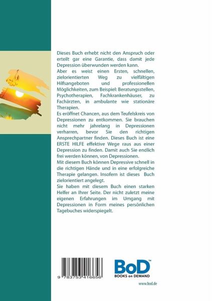 Dieses Buch erhebt nicht den Anspruch oder erteilt gar eine Garantie, dass damit jede Depression überwunden werden kann. Aber es weist einen Ersten, schnellen, zielorientierten Weg in vielfältigen Hilfsangebote und professionellen Möglichkeiten: zum Beispiel in Beratungsstellen, Psychotherapien, Fachkrankenhäuser, zu Fachärzten, in ambulante wie stationäre Therapien. Es eröffnet Chancen, aus dem Teufelskreis von Depressionen zu entkommen. Sie brauchen nicht mehr jahrelang in Depressionen verharren, bevor Sie den richtigen Ansprechpartner finden. Dieses Buch ist eine ERSTE HILFE effektive Wege raus aus einer Depression zu finden. Damit auch Sie endlich frei werden können, von Depressionen. Mit diesem Buch können Depressive schnell in die richtigen Hände und in eine erfolgreiche Therapie gelangen. Insofern ist dieses E-Book zielorientiert angelegt. Sie haben mit diesem E-Book einen starken Helfer an Ihrer Seite.