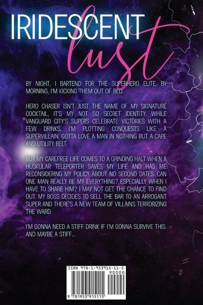 By night, I bartend for the superhero elite. By morning, I'm kicking them out of bed. Hero Chaser isn't just the name of my signature cocktail, it's my not so secret identity. While Vanguard City's supers celebrate victories with a few drinks, I'm plotting conquests like a supervillain. Gotta love a man in nothing but a cape and utility belt. But my carefree life comes to a grinding halt when a huskular teleporter saves my life and has me reconsidering my policy about no second dates. Can one man really be my everything? Especially when I have to share him? I may not get the chance to find out. My boss decides to sell the bar to an arrogant super and there's a new team of villains terrorizing the Ward. I'm gonna need a stiff drink if I'm gonna survive this. And maybe a stiff... Iridescent Lust is a M/M, heart-felt adventure with an HEA and no cliffhangers. It features snark and sex, but not always in that order. This is book three in the Men of Vanguard series.