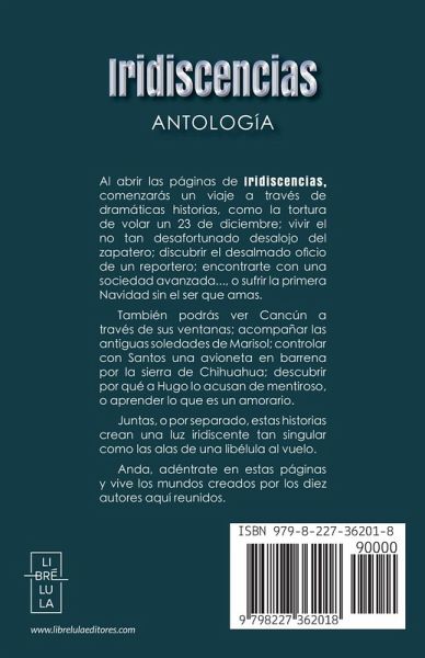 Al abrir las páginas de Iridiscencias, comenzarás un viaje a través de dramáticas historias, como la tortura de volar un 23 de diciembre; vivir el no tan desafortunado desalojo del zapatero; descubrir el desalmado oficio de un reportero; encontrarte con una sociedad avanzada..., o sufrir la primera Navidad sin el ser que amas. También podrás ver Cancún a través de sus ventanas; acompañar las antiguas soledades de Marisol; controlar con santos una avioneta en barrena por la sierra de Chihuahua; descubrir por qué a Hugo lo acusan de mentiroso, o aprender lo que es un amorario. Juntas, o por separado, estas historias crean una luz iridiscente tan singular como las alas de una libélula al vuelo. Anda, adéntrate en estas páginas y vive los mundos creados por los diez autores aquí reunidos.