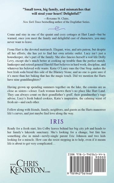 Ready for a fresh start, Iris Colby leaves behind her big city job and heads to her family's lakeside sanctuary. She's looking for a change, but fate has something else in mind-newly-single parent Eric Johnson and two kids looking for a miracle. How can she resist stepping in to help, even if it means life is about to get very complicated... "Small town, big family, and mismatches that will steal your heart! Delightful!" Roxanne St. Claire, New York Times bestselling author of the Dogfather Series. More on Hart Land Lakeside Inn: Come and stay in one of the quaint and cozy cottages at Hart Land-but be warned, once you meet the family and delightful cast of characters, you may never want to leave. Fiona Hart is the devoted matriarch. Elegant, wise, and arts patron, but despite all her efforts, she has yet to find her own artistic outlet. Lucy isn't just a housekeeper, she's part of the family. She also fancies herself a real life Dolly Levy, except she's much better at cooking up trouble than the perfect match. Innkeeper and retired general Harold Hart believes in hard work, discipline, and whatever his beloved wife wants. Katie O'Leary runs the One Stop, makes the best Irish soda bread this side of the Blarney Stone, and no one is quite sure if it's more than her baking that has the magic touch. Did we mention the Harts have nine granddaughters? Having grown up spending summers together on the lake, the cousins are as close as sisters-closer. Each woman knows there's no place like Hart Land. They can always count on their grandfather's gruff, their grandmother's sage advise, Lucy's fresh baked cookies, Katie's inspiration, the calming scent of fresh air-and each other. Follow along with friends, family, neighbors, and guests as the Harts maneuver life's curves, and just maybe find love along the way. As a Special Bonus IRIS includes a treat from Lily's Recipe Box! "Chris Keniston gives us a world you'll never want to leave." Emily March, New York Times Bestselling Author of Eternity Springs series. Look for more books in the Hart Land Lakeside Inn series: Heather - book one Lily - book two Violet - book three Iris - book four Hyacinth - book five Rose - book six Callytrix - book seven Zinnia - book eight Poppy - book nine
