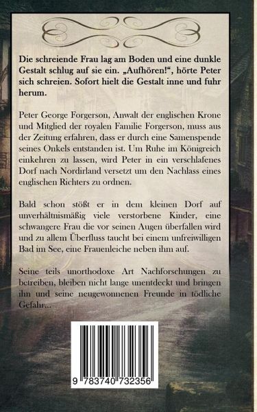 Die schreiende Frau lag am Boden und eine dunkle Gestalt schlug auf sie ein."Aufhören!", hörte Peter sich schreien. Sofort hielt die Gestalt inne und fuhr herum.Peter George Forgerson, Anwalt der englischen Krone und Mitglied der royalen Familie Forgerson, muss aus der Zeitung erfahren, dass er aus einer Samenspende seines Onkels entstanden ist. Um Ruhe im Königreich einkehren zu lassen, wird Peter in ein verschlafenes Dorf nach Nordirland versetzt, um den Nachlass eines englischen Richters zu ordnen.Bald schon stößt er in dem kleinen Dorf auf unverhältnismäßig viele verstorbene Kinder, eine schwangere Frau, die vor seinen Augen überfallen wird, und zu allem Überfluss taucht bei einem unfreiwilligen Bad im See eine Frauenleiche neben ihm auf. Seine teils unorthodoxe Art Nachforschungen zu betreiben, bleiben nicht lange unentdeckt und bringen ihn und seine neugewonnenen Freunde in tödliche Gefahr ...Für spannende Stunden ist gesorgt!