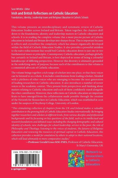 This volume presents an interdisciplinary and systematic review of Catholic Education Studies across Ireland and Britain. Taken together, the chapters drill down to the foundations, identity and leadership matters in Catholic education and schools. It is in reading the complete volume that a more precise picture of Catholic education in Ireland and Britain develops into sharper focus. This is important because it reflects and crystallises the complexity which has almost organically developed within the field of Catholic Education Studies. It also provides a powerful antidote to the naïve reductionism that would boil Catholic education down to just one or two fundamental issues or principles. Contemporary Catholic education, perhaps globally but certainly in Ireland and Britain, is best depicted in terms of being a colourful kaleidoscope of differing perspectives. However this diversity is ultimately grounded in the underlying unity of purpose, because each of the contributors to this volume is a committed advocate of Catholic education. The volume brings together a rich range of scholars into one place, so that these voices can be listened to as a whole. It includes contributions from leading scholars, blended with a plethora of other voices who are emerging to become the next generation of leading researchers in Catholic education. It also introduces a number of newer voices to the academic context. They present fresh perspectives and thinking about matters relating to Catholic education and each of them confidently stand alongside the other contributors. Moreover, these reflections on Catholic education are important fruits to have emerged from the collaboration made possible through the creation of the Network for Researchers in Catholic Education, which was established in 2016 under the auspices of Heythrop College, University of London.