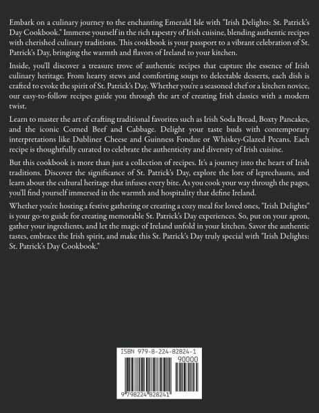 Embark on a culinary journey to the enchanting Emerald Isle with "Irish Delights: St. Patrick's Day Cookbook." Immerse yourself in the rich tapestry of Irish cuisine, blending authentic recipes with cherished culinary traditions. This cookbook is your passport to a vibrant celebration of St. Patrick's Day, bringing the warmth and flavors of Ireland to your kitchen. Inside, you'll discover a treasure trove of authentic recipes that capture the essence of Irish culinary heritage. From hearty stews and comforting soups to delectable desserts, each dish is crafted to evoke the spirit of St. Patrick's Day. Whether you're a seasoned chef or a kitchen novice, our easy-to-follow recipes guide you through the art of creating Irish classics with a modern twist. Learn to master the art of crafting traditional favorites such as Irish Soda Bread, Boxty Pancakes, and the iconic Corned Beef and Cabbage. Delight your taste buds with contemporary interpretations like Dubliner Cheese and Guinness Fondue or Whiskey-Glazed Pecans. Each recipe is thoughtfully curated to celebrate the authenticity and diversity of Irish cuisine. But this cookbook is more than just a collection of recipes. It's a journey into the heart of Irish traditions. Discover the significance of St. Patrick's Day, explore the lore of leprechauns, and learn about the cultural heritage that infuses every bite. As you cook your way through the pages, you'll find yourself immersed in the warmth and hospitality that define Ireland. Whether you're hosting a festive gathering or creating a cozy meal for loved ones, "Irish Delights" is your go-to guide for creating memorable St. Patrick's Day experiences. So, put on your apron, gather your ingredients, and let the magic of Ireland unfold in your kitchen. Savor the authentic tastes, embrace the Irish spirit, and make this St. Patrick's Day truly special with "Irish Delights: St. Patrick's Day Cookbook."