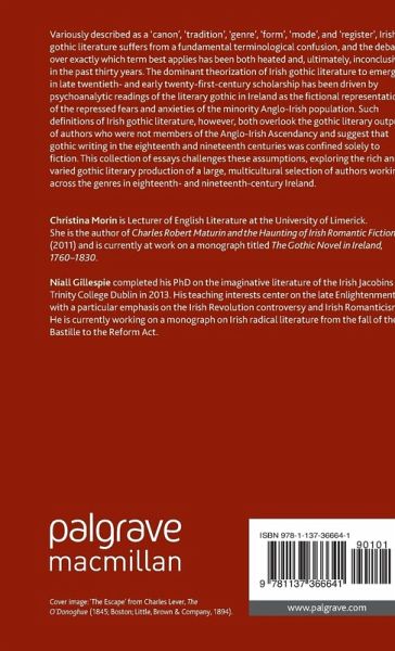 List of Illustrations Acknowledgements Notes on the Contributors Introduction: De-limiting the Irish Gothic; Christina Morin and Niall Gillespie 1. Theorizing 'Gothic' in Eighteenth-Century Ireland; Christina Morin 2. The Irish Protestant Gothic Imaginary: The Cultural Contexts for the Gothic Chapbooks, published by Bennett Dugdale, 1800-1805; Diane Long Hoeveler 3. Irish Jacobin Gothic, c. 1796-1825; Niall Gillespie 4. Suffering Rebellion: Irish Gothic Fiction, 1799-1830; Jim Shanahan 5. The Gothicization of Irish Folklore; Anne Markey 6. Maturin's Catholic Heirs: Expanding the Limits of Irish Gothic; Richard Haslam 7. J.S. Le Fanu, Gothic, and the Irish Periodical; Elizabeth Tilley 8. 'Whom We Name Not': The House by the Churchyard and its Annotation; W.J. Mc Cormack 9. Muscling Up: Bram Stoker and Irish Masculinity in The Snake's Pass; Jarlath Killeen 10. 'The Old Far West and the New': Bram Stoker, Race, and Manifest Destiny; Luke Gibbons Index
