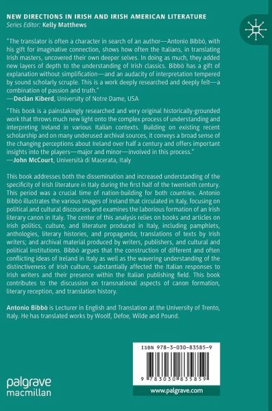 This book addresses both the dissemination and increased understanding of the specificity of Irish literature in Italy during the first half of the twentieth century. This period was a crucial time of nation-building for both countries. Antonio Bibbò illustrates the various images of Ireland that circulated in Italy, focusing on political and cultural discourses and examines the laborious formation of an Irish literary canon in Italy. The center of this analysis relies on books and articles on Irish politics, culture, and literature produced in Italy, including pamplets, anthologies, literary histories, and propaganda; translations of texts by Irish writers; and archival material produced by writers, publishers, and cultural and political institutions. Bibbò argues that the construction of different and often conflicting ideas of Ireland in Italy as well as the wavering understanding of the distinctiveness of Irish culture, substantially affected the Italian responses to Irish writers and their presence within the Italian publishing field. This book contributes to the discussion on transnational aspects of canon formation, reception studies, and Italian cultural studies.