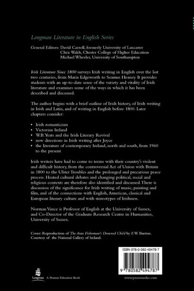 Vance moves from a brief survey of Irish literature prior to 1800 onto the contexts of Irish writing since 1800 covering, romanticism, the Victorian period, the Literary Revival and contemporary Irish writing. He also looks at Ireland in Europe and the Atlantic world, Irish cultural debates and current affairs as contexts for recent and contemporary literature.