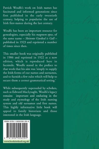 Patrick Woulfe's work on Irish names has fascinated and informed generations since first published in the early twentieth century, helping to popularise the use of Irish first-names during the last century. Woulfe has been an important resource for genealogists, especially his magnum opus, of the same name - Sloinnte Gae¿eal is Gall - published in 1923 and reprinted a number of times since then. This smaller book was originally published in 1906 and reprinted in 1922 as a new edition, which is reproduced here in facsimile. Woulfe stated in his preface to that work that his aim was 'simply to supply the Irish forms of our names and surnames, and to furnish a few rules which will help to secure them a correct grammatical setting.' While subsequently superseded by scholars, such as Edward MacLysaght, Woulfe's legacy remains important and enduring in the study and etymology of the Irish naming system and old surnames and first names. This highly informative little book will appeal to family historians and those interested in the Irish language. NOTE: Buyers should be aware that this is not the large publication of the same name, Sloinnte Gae¿eal is Gall - published in 1923 and reprinted by the Genealogical Publishing Company, Baltimore 1967 (and subsequently reproduced on other occasions). The larger work, for which Woulfe is best known, runs to 696pp, with 46 pages of preliminary text, while this small publication extends to 168 pages.