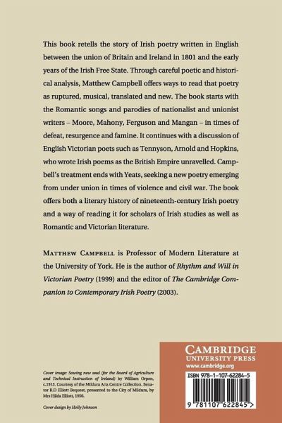 This book retells the story of Irish poetry written in English between the union of Britain and Ireland in 1801 and the early years of the Irish Free State. Through careful poetic and historical analysis, Matthew Campbell offers ways to read that poetry as ruptured, musical, translated and new. The book starts with the Romantic songs and parodies of nationalist and unionist writers - Moore, Mahony, Ferguson and Mangan - in times of defeat, resurgence and famine. It continues through a discussion of English Victorian poets such as Tennyson, Arnold and Hopkins, who wrote Irish poems as the British Empire unraveled. Campbell's treatment ends with Yeats, seeking a new poetry emerging from under union in times of violence and civil war. The book offers both a literary history of nineteenth-century Irish poetry and a way of reading it for scholars of Irish studies as well as Romantic and Victorian literature.