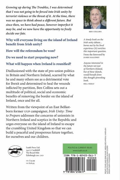 Growing up during The Troubles, I was determined that I was not going to be forced into Irish unity by terrorist violence or the threat of it. At the time, there was no space to think about a different future. But since then, we have had peace, however imperfect it may be, and we now have the opportunity to freely decide our fate. Why will everyone living on the island of Ireland benefit from Irish unity? How will the referendum be won? Do we need to start preparing now? What will happen when Ireland is reunified? Disillusioned with the state of pro-union politics in Britain and Northern Ireland, scarred by what he and many others see as a detrimental vote for Brexit and determined to heal the wounds inflicted by partition, Ben Collins sets out a multitude of political, social and economic benefits of removing the border on the island of Ireland, once and for all. Written from the viewpoint of an East Belfast-born former UUP campaigner, Irish Unity: Time to Prepare addresses the concerns of unionists in Northern Ireland and sceptics in the Republic and urges everyone on the island of Ireland to escape the crumbling United Kingdom so that we can build a peaceful and prosperous future together, for ourselves and our children.