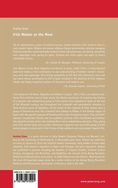 Irish women on the Move: Migration and Mission in Spain, 1499-1700 is an original work, drawn from archival sources from across the Iberian peninsula. It examines the history of a dynamic and enterprising group of Irish women who migrated to Spain at the end of the fifteenth century, and throughout the sixteenth and seventeenth centuries in three distinct waves of migration. At the centre of this network of Irish women were a group of Dominican nuns who travelled from Galway to Bilbao in the Bizkaia region of Spain with the specific purpose of founding their order throughout Spain. They and their sponsors established schools and an academic curricula which facilitated assimilation into Spanish society whilst also marking them out as outstanding educators. They, along with Irish women spies and courtiers show how a dynamic and successful group of Irish women played a central part in the history of late medieval and early modern Spanish life.