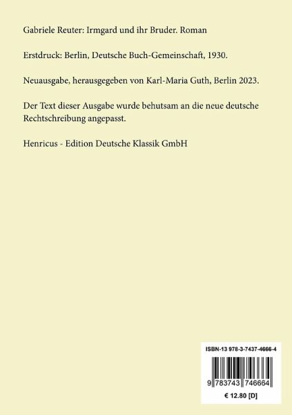 Gabriele Reuter: Irmgard und ihr Bruder. RomanErstdruck: Berlin, Deutsche Buch-Gemeinschaft, 1930.Neuausgabe, herausgegeben von Karl-Maria Guth, Berlin 2023.Der Text dieser Ausgabe wurde behutsam an die neue deutsche Rechtschreibung angepasst.Umschlagabbildung: Gabriele Reuter, München, 1896.Gesetzt aus der Minion Pro, 11 pt.Die Sammlung Hofenberg erscheint im Verlag Henricus - Edition Deutsche Klassik GmbH, Berlin
