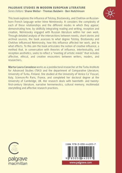 This book explores the influence of Tolstoy, Dostoevsky, and Chekhov on Russian-born French language writer Irène Némirovsky. It considers the complexity of each of these relationships and the different modes in which they appear; demonstrating how, by skillfully integrating reading and writing, reception and creation, Némirovsky engaged with Russian literature within her own work. Through detailed analysis of the intersections between novels, short stories and archival sources, the book assesses to what degree Tolstoy, Dostoevsky and Chekhov influenced Némirovsky, how this influence affected her work, and to what effects. To this aim the book articulates the notion of creative influence, a method that, in conversation with theories of influence, intertextuality, and reception aesthetics, seeks to reflect a "meeting of artistic minds" that includesaffective, ethical, and creative encounters between writers, readers, and researchers.