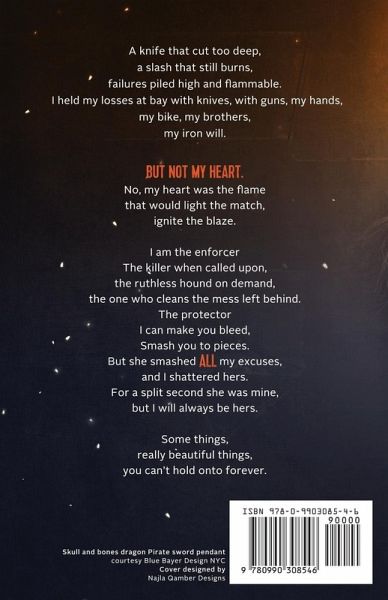 A knife that cut too deep, a slash that still burns, failures piled high and flammable. I held my losses at bay with knives, with guns, my hands, my bike, my brothers, my iron will. But not my heart. No, my heart was the flame that would light the match, ignite the blaze. I am the enforcer The killer when called upon, the ruthless hound on demand, the one who cleans the mess left behind. The protector I can make you bleed, Smash you to pieces. But she smashed all my excuses, and I shattered hers. For a split second she was mine, but I will always be hers. Some things, really beautiful things, you can't hold onto forever.