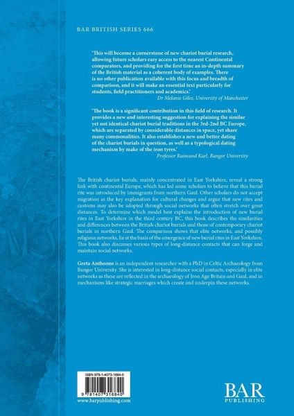 The British chariot burials, mainly concentrated in East Yorkshire, reveal a strong link with continental Europe, which has led some scholars to believe that this burial rite was introduced by immigrants from northern Gaul. Other scholars do not accept migration as the key explanation for cultural changes and argue that new rites and customs may also be adopted through social networks that often stretch over great distances. To determine which model best explains the introduction of new burial rites in East Yorkshire in the third century BC, this book describes the similarities and differences between the British chariot burials and those of contemporary chariot burials in northern Gaul. The comparison shows that elite networks, and possibly religious networks, lie at the basis of the emergence of new burial rites in East Yorkshire. This book also discusses various types of long-distance contacts that can forge and maintain social networks.