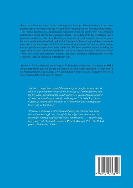 Black Horse Farm is situated on the Cambridgeshire fen-edge. During the Iron Age and early Romano-British period it occupied a low promontory reaching out into the surrounding wetland. This volume describes the archaeological excavation of the site and the Iron Age settlement and Romano-British activity that was recorded there. The wetland of the fen would have been a prominent part of everyday life at Black Horse Farm and the book examines the way in which the site's inhabitants utilised and exploited it. Fluctuations between dry and damp conditions were also a prominent aspect of life at this marginal location and the later sections examine how the population responded to these conditions. The book examines themes including the organisation of space within the roundhouse, the role of ditches and banks as flood defences versus their social and defensive function, and offers alternative interpretations for some commonly observed features at contemporary sites. With contributions by Beta Analytic Inc., Jane Cowgill, Nina Crummy, Julia E. Cussans, Val Fryer, Andrew Peachey, Ruth Pelling, Carina Phillips, Rob Scaife and Maisie Taylor Illustrations by Kathren Henry, Charlotte Davies and Caroline George