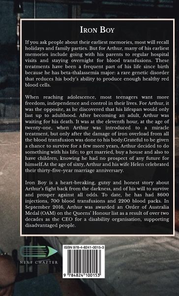 If you ask people about their earliest memories, most will recall holidays and family parties. But for Arthur, many of his earliest memories include going with his parents to regular hospital visits and staying overnight for blood transfusions. These treatments have been a frequent part of his life since birth because he has beta-thalassemia major: a rare genetic disorder that reduces his body's ability to produce enough healthy red blood cells. When reaching adolescence, most teenagers want more freedom, independence and control in their lives. For Arthur, it was the opposite, as he discovered that his lifespan would only last up to adulthood. After becoming an adult, Arthur was waiting for his death. It was at the eleventh hour, at the age of twenty-one, when Arthur was introduced to a miracle treatment, but only after the damage of iron overload from all the blood transfusion was done to his body. Grateful to be given a chance to survive for a few more years, Arthur decided to do something with his life; to get married, buy a house and also to have children, knowing he had no prospect of any future for himself. At the age of sixty, Arthur and his wife Helen celebrated their thirty-five-year marriage anniversary. Iron Boy is a heart-breaking, gutsy and honest story about Arthur's fight back from the darkness, and of his will to survive and prosper against all odds. To date, he has had 8600 injections, 700 blood transfusions and 2200 blood packs. In September 2016, Arthur was awarded an Order of Australia Medal (OAM) on the Queens' Honour list as a result of over two decades as the CEO for a disability organisation, supporting disadvantaged people.