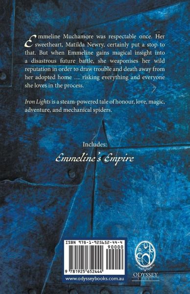 Emmeline Muchamore was respectable once. Her sweetheart, Matilda Newry, certainly put a stop to that. But when Emmeline gains magical insight into a disastrous future battle, she weaponises her wild reputation in order to draw trouble and death away from her adopted home … risking everything and everyone she loves in the process. Iron Lights is a steam-powered tale of honour, love, magic, adventure, and mechanical spiders.