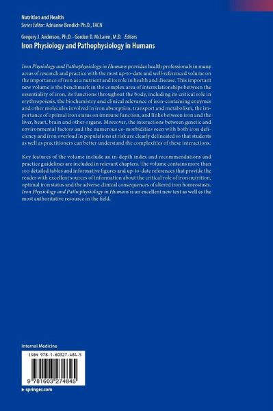 Iron Physiology and Pathophysiology in Humans provides health professionals in many areas of research and practice with the most up-to-date and well-referenced volume on the importance of iron as a nutrient and its role in health and disease. This important new volume is the benchmark in the complex area of interrelationships between the essentiality of iron, its functions throughout the body, including its critical role in erythropoiesis, the biochemistry and clinical relevance of iron-containing enzymes and other molecules involved in iron absorption, transport and metabolism, he importance of optimal iron status on immune function, and links between iron and the liver, heart, brain and other organs. Moreover, the interactions between genetic and environmental factors and the numerous co-morbidities seen with both iron deficiency and iron overload in at risk populations are clearly delineated so that students as well as practitioners can better understand the complexities of these interactions.