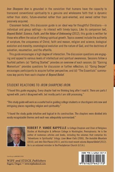 Iron Sharpens Iron is grounded in the conviction that humans have the capacity to transcend conventional spirituality to a genuine and wholesome faith that is dynamic rather than static, future-oriented rather than past-oriented, and owned rather than passively acquired. Classroom tested, this discussion guide is an ideal way for thoughtful Christians--in individual and group settings--to interact with timely topics. Like its companion text, Beyond Belief: Science, Faith, and the Value of Unknowing (2012), this guide is written for those who affirm the value of lifelong spiritual growth. Topics covered include the authority of scripture, the uniqueness of Christ, faith and reason, religion and science, biological evolution and morality, cosmological evolution and the nature of God, and the doctrines of salvation, resurrection, and the afterlife. This guide encourages a high degree of interaction. The discussion questions are engaging and appeal to various levels of intellectual and spiritual awareness. Sessions follow a fourfold pattern: (a) ""Getting Started"" provides an overview of each session; (b) ""Gaining Momentum"" provides questions for discussion or further reflection; (c) ""Going Deeper"" encourages participants to acquire further perspective; and (d) ""The Essentials"" summarizes key points from each chapter of Beyond Belief.