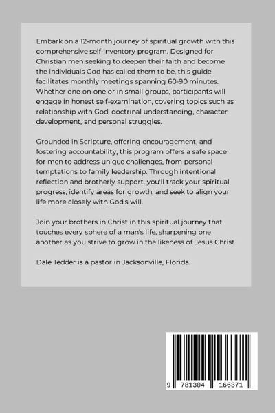 Embark on a 12-month journey of spiritual growth with this comprehensive self-inventory program. Designed for Christian men seeking to deepen their faith and become the individuals God has called them to be, this guide facilitates monthly meetings spanning 60-90 minutes. Whether one-on-one or in small groups, participants will engage in honest self-examination, covering topics such as relationship with God, doctrinal understanding, character development, and personal struggles. Grounded in Scripture, offering encouragement, and fostering accountability, this program offers a safe space for men to address unique challenges, from personal temptations to family leadership. Through intentional reflection and brotherly support, you'll track your spiritual progress, identify areas for growth, and seek to align your life more closely with God's will. Join your brothers in Christ in this spiritual journey, sharpening one another as you strive to grow in the likeness of Jesus Christ. Dale Tedder is a pastor in Jacksonville, Florida.
