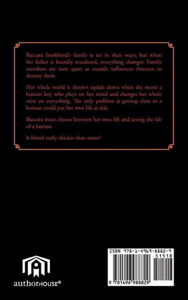 Baccara Ironblood?s family is set in their ways, but when her father is brutally murdered, everything changes. Family members are torn apart as outside influences threaten to destroy them. Her whole world is thrown upside down when she meets a human boy who plays on her mind and changes her whole view on everything. The only problem is getting close to a human could put her own life at risk. Baccara must choose between her own life and saving the life of a human. Is blood really thicker than water?