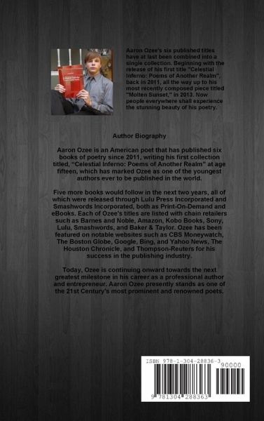 American Author and poet Aaron Ozee has brought you multiple works of poetic beauty, but never until now has each one of his published titles been combined together into a single collection. The world will at last know poetry at its finest.