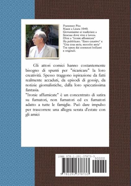 "Ironie affumicate" è un concentrato di battute sui fumatori, sui non fumatori e sugli ex fumatori. Visti con la lente d'ingrandimento tutte e tre le categorie possono risultare abbastanza comiche nelle loro azioni quotidiane. Il testo è adatto a tutte le famiglie. ...Signora, che fa, mi butta la polvere e i peluche del suo zerbino sulla testa? Non vede che ci sono io che fumo?