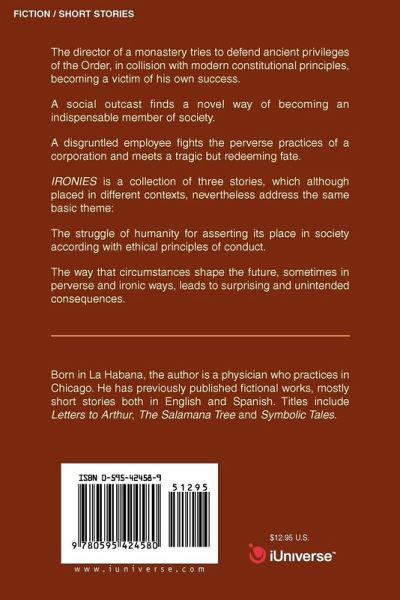 The director of a monastery tries to defend ancient privileges of the Order, in collision with modern constitutional principles, becoming a victim of his own success. A social outcast finds a novel way of becoming an indispensable member of society. A disgruntled employee fights the perverse practices of a corporation and meets a tragic but redeeming fate. IRONIES is a collection of three stories, which although placed in different contexts, nevertheless address the same basic theme: The struggle of humanity for asserting its place in society according with ethical principles of conduct. The way that circumstances shape the future, sometimes in perverse and ironic ways, leads to surprising and unintended consequences.