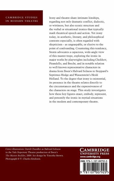 Irony and theatre share intimate kinships, not only regarding dramatic conflict, dialectic or wittiness, but also scenic structure and the verbal or situational ironies that typically mark theatrical speech and action. Yet irony today, in aesthetic, literary and philosophical contexts especially, is often regarded with skepticism - as ungraspable, or elusive to the point of confounding. Countering this tendency, William Storm advocates a wide-angle view of this master trope, exploring the ironic in major works by playwrights including Chekhov, Pirandello and Brecht, and in notable relation to well-known representative characters in drama from Ibsen's Halvard Solness to Stoppard's Septimus Hodge and Wasserstein's Heidi Holland. To the degree that irony is existential, its presence in the theatre relates directly to the circumstances and the expressiveness of the characters on stage. This study investigates how these key figures enact, embody, represent and personify the ironic in myriad situations in the modern and contemporary theatre.