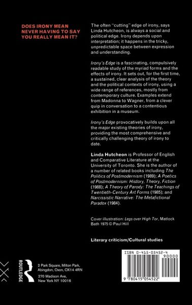 The edge of irony, says Linda Hutcheon, is always a social and political edge. Irony depends upon interpretation; it happens in the tricky, unpredictable space between expression and understanding. Irony's Edge is a fascinating, compulsively readable study of the myriad forms and the effects of irony. It sets out, for the first time, a sustained, clear analysis of the theory and the political contexts of irony, using a wide range of references from contemporary culture. Examples extend from Madonna to Wagner, from a clever quip in conversation to a contentious exhibition in a museum. Irony's Edge outlines and then challenges all the major existing theories of irony, providing the most comprehensive and critically challengin theory of irony to date.