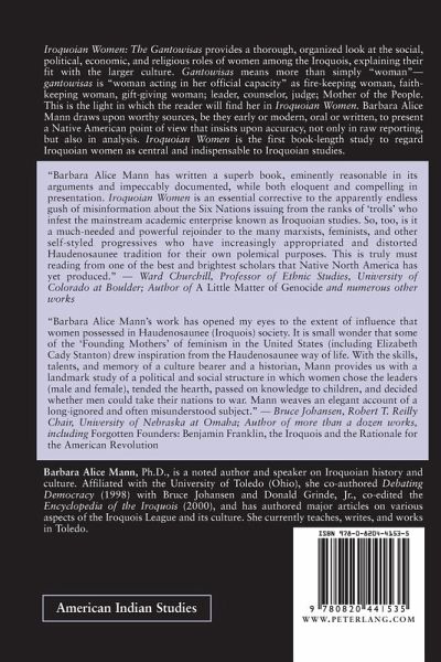 «Barbara Alice Mann has written a superb book, eminently reasonable in its arguments and impeccably documented, while both eloquent and compelling in presentation. 'Iroquoian Women' is an essential corrective to the apparently endless gush of misinformation about the Six Nations issuing from the ranks of 'trolls' who infest the mainstream academic enterprise known as Iroquoian studies. So, too, is it a much-needed and powerful rejoinder to the many marxists, feminists, and other self-styled progressives who have increasingly appropriated and distorted Haudenosaunee tradition for their own polemical purposes. This is truly must reading from one of the best and brightest scholars that Native North America has yet produced.» (Ward Churchill, Professor of Ethnic Studies, University of Colorado at Boulder; Author of 'A Little Matter of Genocide' and numerous other works)